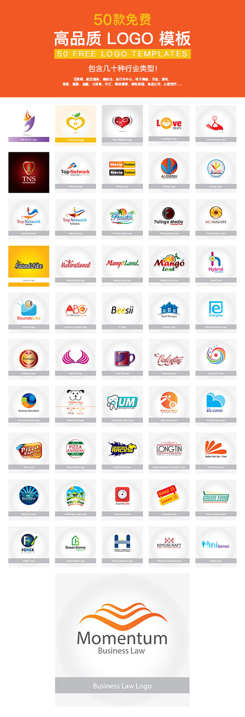 包含几十种行业:互联网、航空服务、商务法、自行车中心、电子舞曲、牙齿、爱电、家居、能源、金融、火体育、外汇、果味爱情、绿色家园、食品公司、心脏医疗……