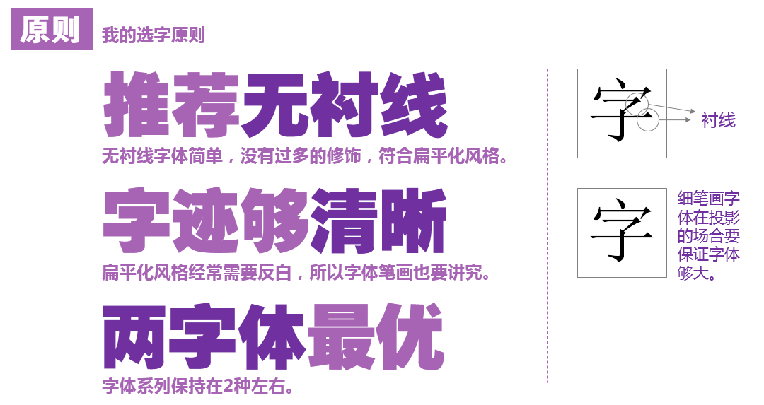 PPT主要靠逻辑说服听众,原型主要靠用户页面展示让团队清楚信息流程和展现样式,所以没必要在字体上做文章,中文字体微软雅黑和英文字体MS YAHEI非常适合PPT的一种无衬线字体,如果微软雅黑的粗体依然不够,可以考虑下载 方正超粗 并且黏贴到到windows/Fonts的文件夹。