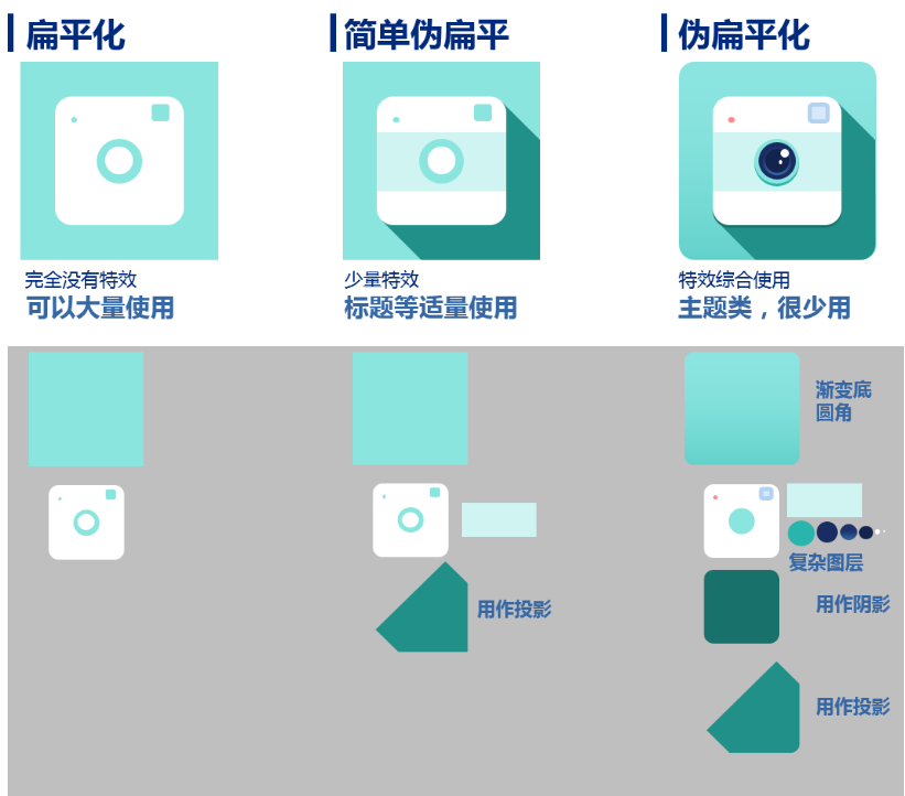 IOS和Android设计规范引领了设计趋势,现在互联网产品、海报和PPT设计均从拟物化向扁平化发展,而什么是扁平化呢?扁平化可以简单的分为三种:真的扁平化,简单伪扁平化和伪扁平化。真的扁平化没有阴影明暗变化,简单伪扁平化有阴影但是没有高光和细节,扁平化有阴影,有高光和细节,如下图所示,附设计方法,建议大家模仿制作一次,模仿是学习设计的最好方法。