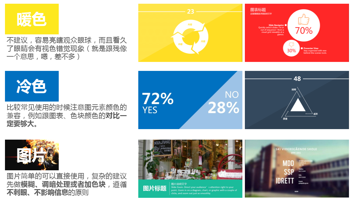 PPT的配色可以简单分几类,纯色,背景图,纹理背景等,一页PPT最好不超过三种颜色,不要使用刺眼的纯色,可以微调色相,适当调低饱和度和亮度。下文中会介绍制作PPT,原型和海报的常用工具,查看第二章:工具推荐。
