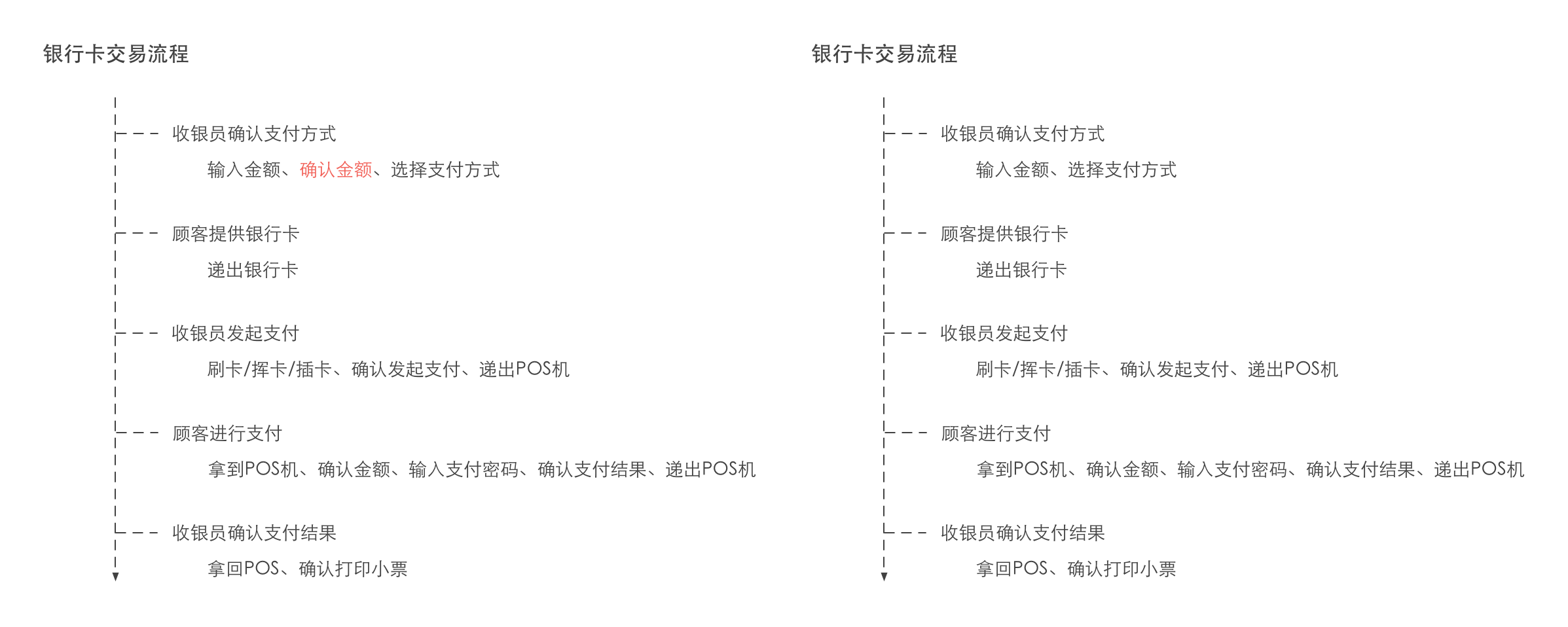 主要差别在于,前者多一步“确认金额”的动作,而这步动作是真的要操作的,不像“顾客进行支付”任务中的“确认金额”只需用户看一眼。从简化交互行为的原则出发,“确认金额”这步操作完全可以省略,这样,整体交互流程会更加地流畅、高效。设计启示:智能POS是一个多用户交替使用的产品,在设计行为时可运用科学的动作分类法,将行为拆解到每一步动作,对每个动作打磨体验,从而提升整体行为的体验。