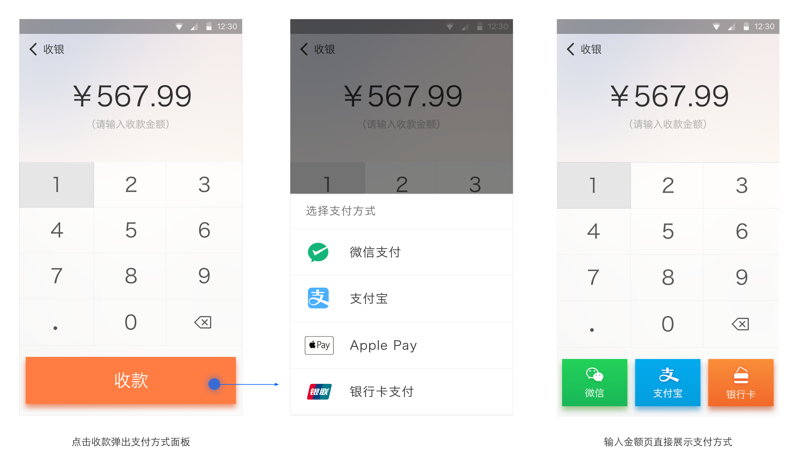 这个方法也帮助我们在设计收银流程方案时很好地做出了决策。方案中关于是“输入完金额点击确认后再选择支付方式”还是“输入完金额直接选择支付方式”哪种更好拿捏不定,前者的操作路径更完整,更明确,同时针对多种支付方式有更好的拓展性;后者不易拓展,但少一步点击,更加高效。