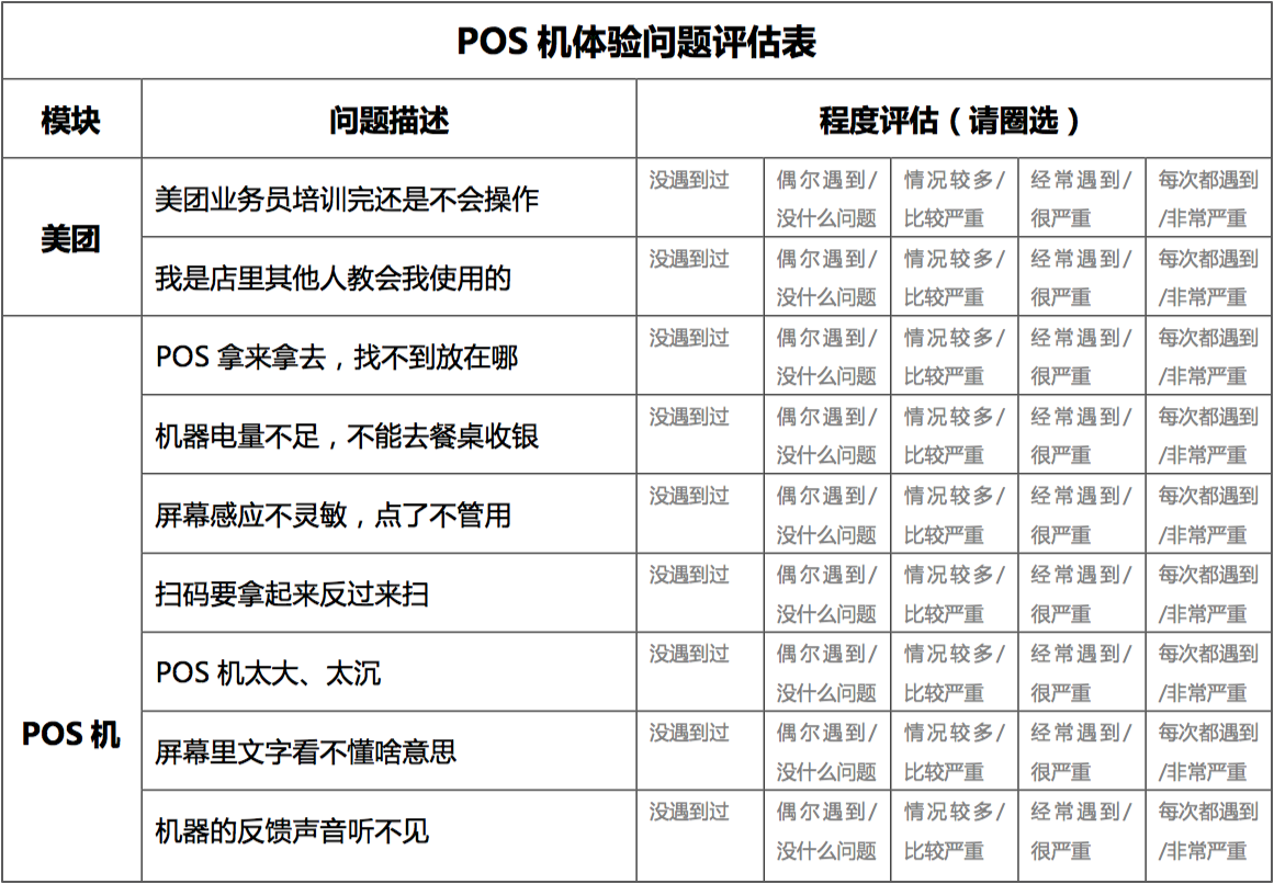 店访主要分为两部分:观察和访谈。观察的是商家店内环境和收银员实际使用POS的场景。观察需特别关注光照、噪音、收银台空间等等因素,除了肉眼观察,还可借助工具,例如摄像,不过这需要经过商家的同意以及注意拍摄角度不能侵犯到个人隐私。访谈需要一定的用研经验,保证结果的准确度,这一环节设计师都有事先经过用研的指导培训,了解了一些话术和注意事项,具体的不再展开讲述。