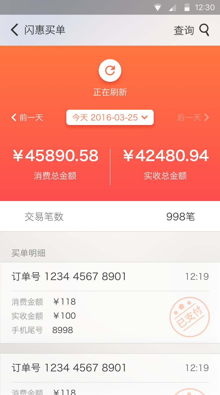 走查后发现,原加载的反馈确实很隐晦,难以跟手机的加载反馈关联一致。因此,我们设计了视觉上更加明显的加载样式,同时,为了让收银员建立起“POS和手机一样下拉可刷新页面”的映射关系,增加了一处交互逻辑:打开买单明细页时,自动进行一次加载,将“下拉可刷新页面”这一认知主动传达给用户。设计上线后,成功解决了用户的困扰,也再没有收到过类似的反馈。这带给我们的设计启示是:当新工具具有旧工具没有的交互方式时,可借鉴用户习惯使用的其他工具的交互方式,同时传递这一认知。