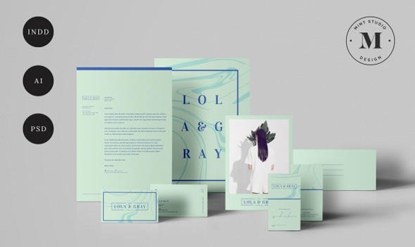 Lola & Gray 的VI包括以下元素:名片、信纸、信封、明信片和任命卡。它有一个大理石图案,任何品牌都适用这个图案,可编辑性很强。