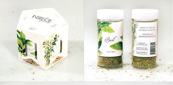 高端草药品牌Inspice的品牌标识。它创造性地设计的三款包装,以用于商超分开销售(分别是砧板、香料包,和倾倒橄榄油的容器)。